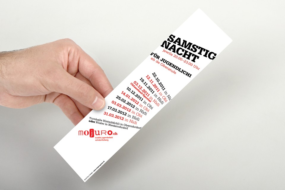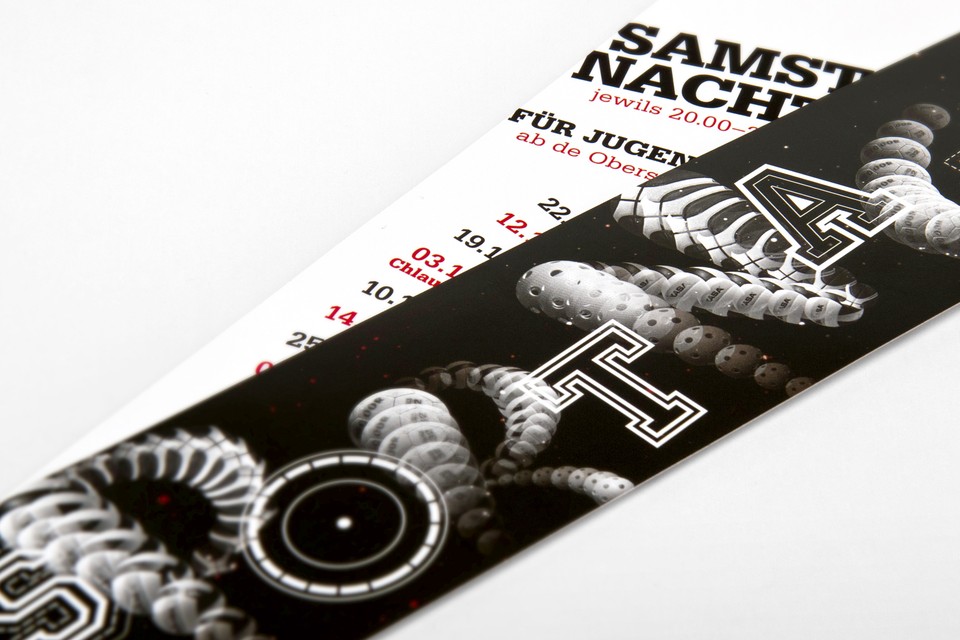 An einer Sportnacht wird die Turnhalle Samstag Abend für Jugendliche geöffnet. Die Werbung für die mittlerweile 4. Staffel der Veranstaltungsreihe inszeniert Bälle als Kometen am Nachthimmel. Das Sujet verbindet die Themen Bewegung und Nacht. Für die Wiedererkennung wird die Ästhetik vergangener Sujets auch dieses Mal neu interpretiert. Über Plakate, Flyer und Shirts wird so konsequent ein professioneller Auftritt der Veranstaltung etabliert.